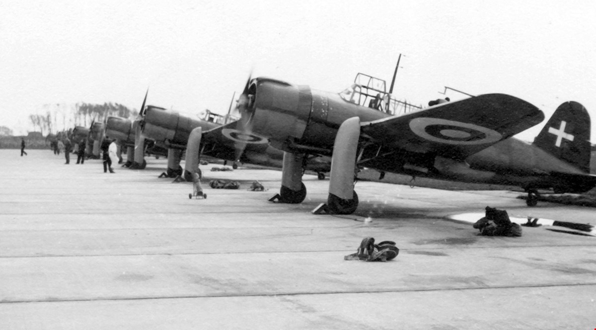 “Den danske brigades flystyrker i Sverige. Saab B-17 flyene står på række. 5. maj 1945”